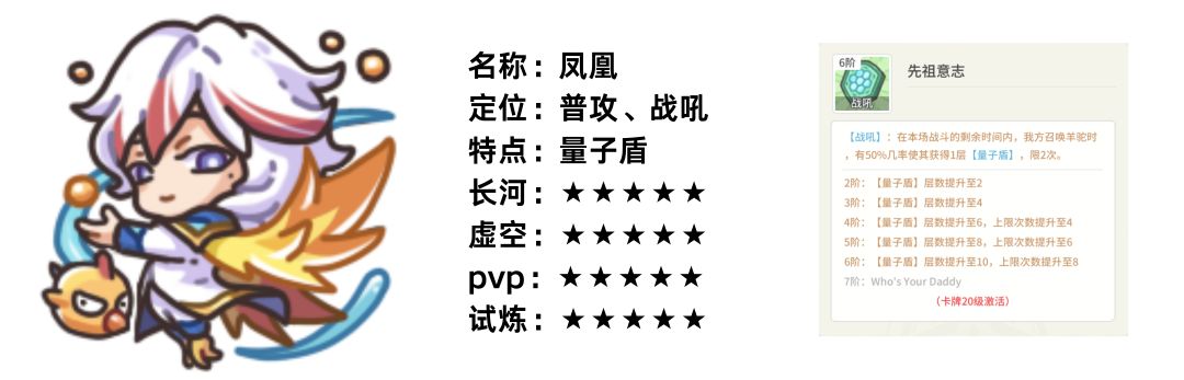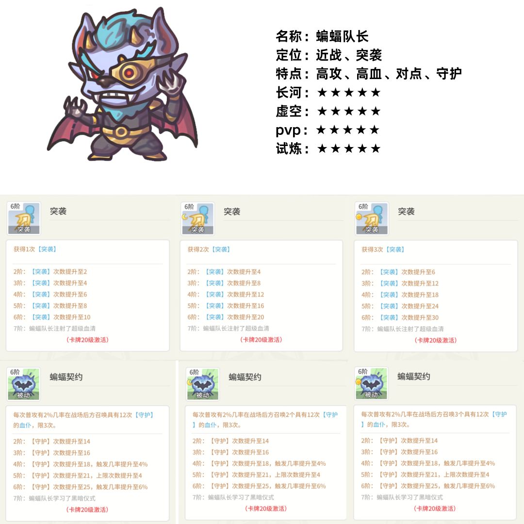 虽然只有一个技能,但是功能性很全面的一张卡,也是我个人比较喜欢用的一张金卡。可以为蝙蝠将军等主要输出点位提供额外的攻击以及量子盾,同时还能使被强化单位具有守护的能力。作为被强化后的蝙蝠将军,即便耗满守护,也有一定的留场能力,同时也可以为我方其他单位制造留场条件。无论是长河中打老虎还是虚空中对位守卫阵容中的关键点位,也不用担心蝙蝠自身伤害不足,导致即便突袭也无法制造对方关键点位掉点的尴尬窘境(葫芦娃大娃阵容与赵常龙阵容常见)。