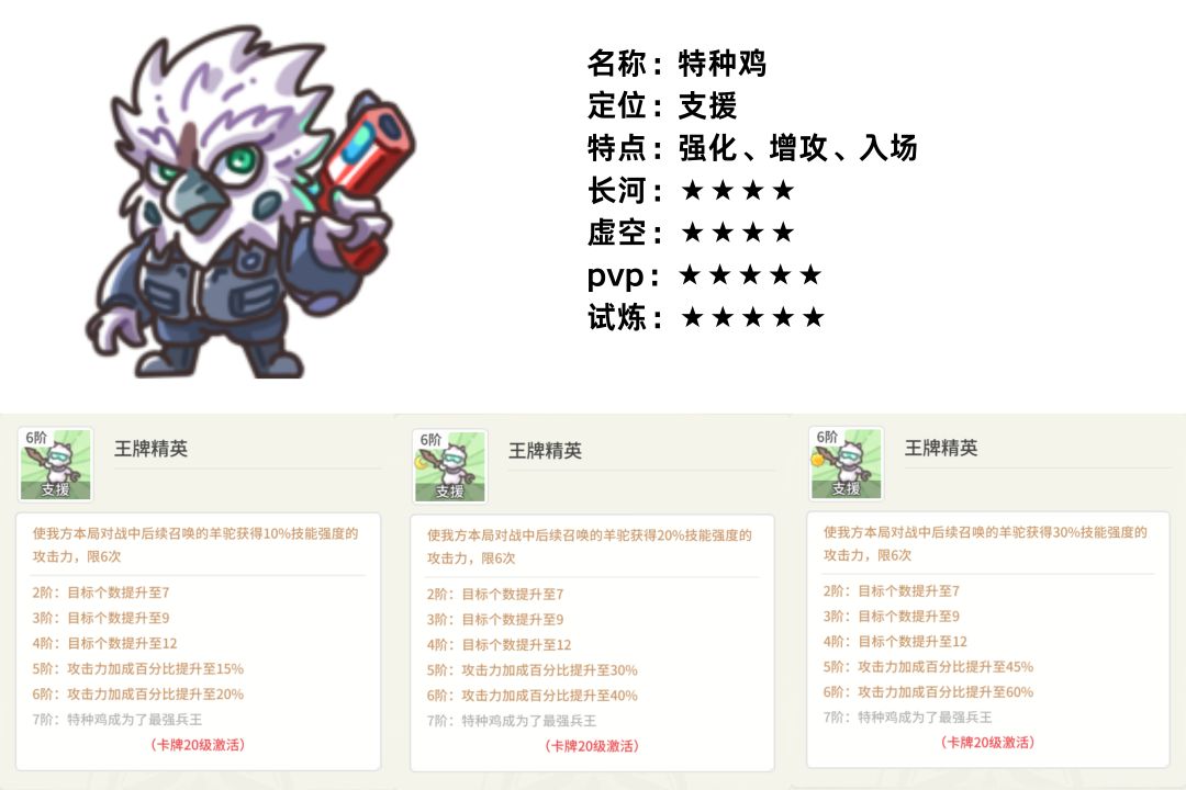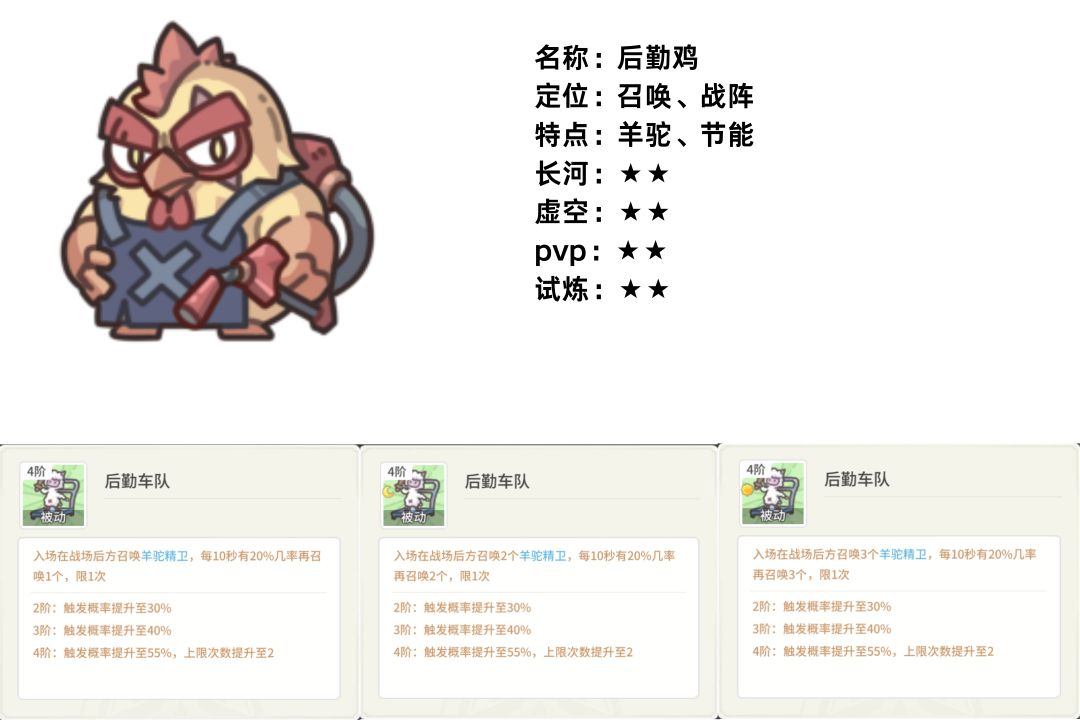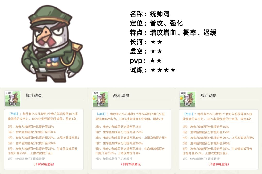 更新后,优化了统帅鸡强化的时间,从原本的每秒概率判定到入场即强化。但由原本的攻血双向强化,改为对攻击属性double的强化。统帅鸡让羊驼彻底成了敢死队。打完进攻就离场,根本不占位置。但也就玩玩原初试炼和讨伐魔物算了。