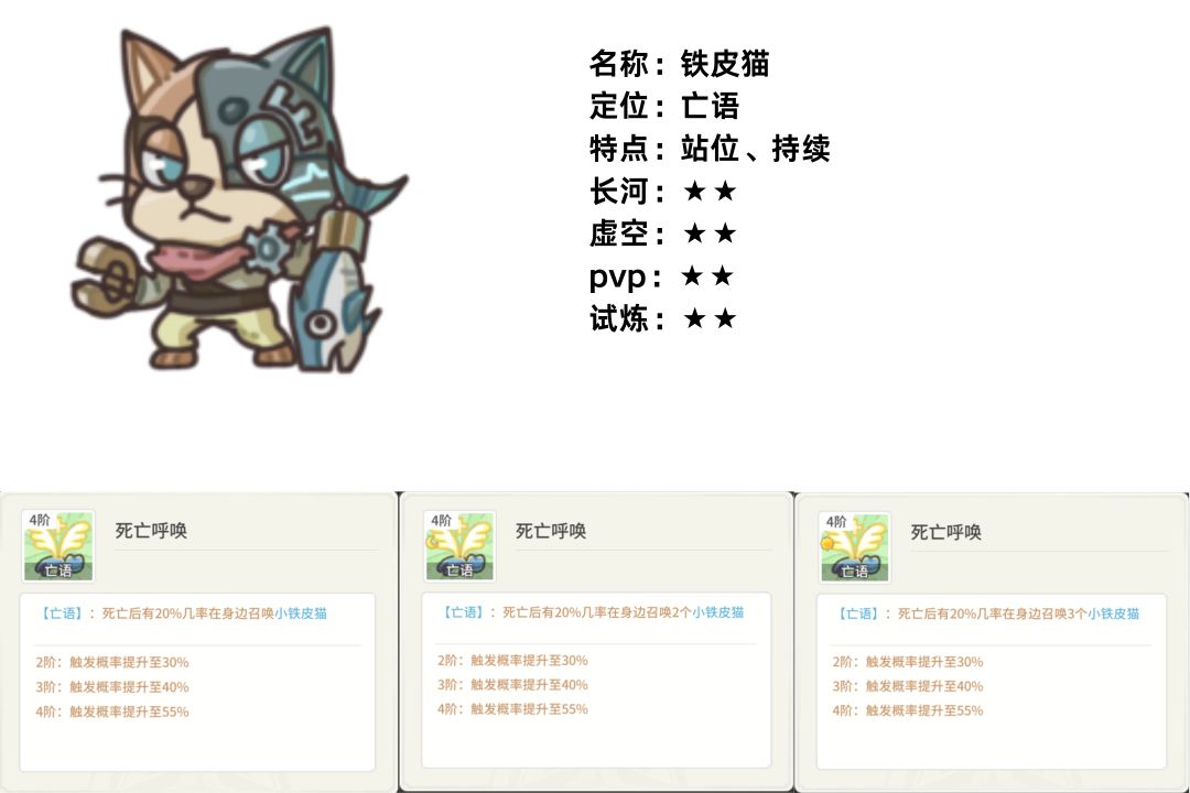 用处不大,死亡后概率性的在阵亡地点召唤一只小猫,能够提供一点简单的站位和勾引效果。即便在大前期,也没什么上场空间。