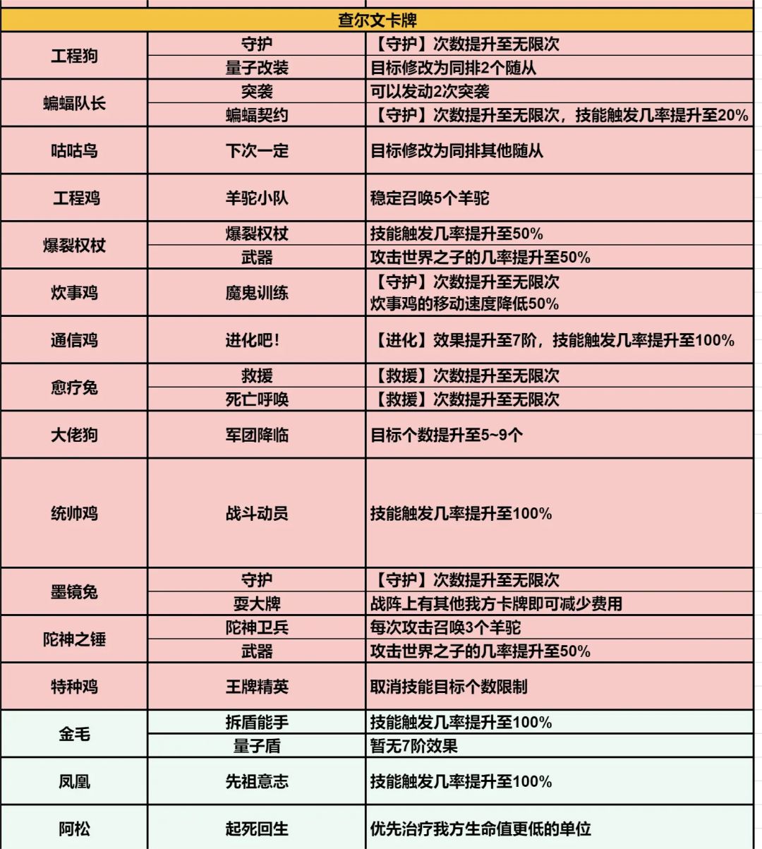 有能力尽量去换的一张卡。有50%的概率使入场的羊驼获得量子盾。无论是是羊驼流起到保护的作用,还是一好消耗量子盾的单位叠攻的流派,无疑都是一个很大的助力。也是三张彩卡中的首选。当然,对于查尔文而言,彩卡的作用就是锦上添花,对于流派起不到引领的作用。