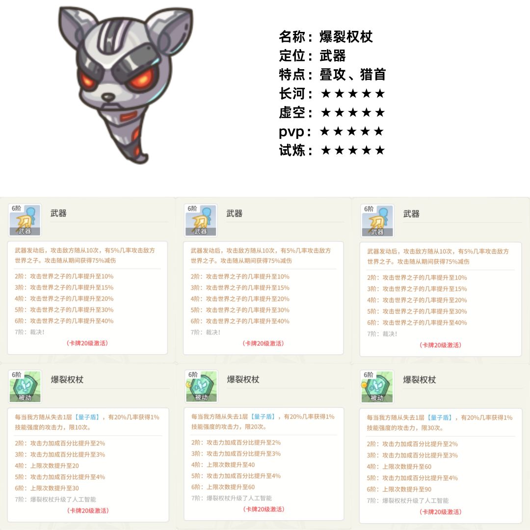 一张看上去很唬人的卡,携带量子盾且具有随从破盾,便可叠攻的效果。但判定概率很低,而且叠加效果很慢。一张想象空间很足,但实战效果很差的一张卡。