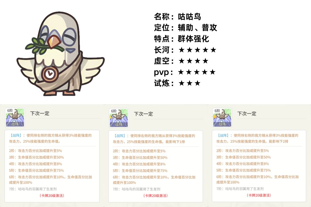 太阳品质下,可以对全体随从提供一个增攻增血的效果,摆放位置也相对固定,就是左上角。但对于追求极致伤害的模式中(例如原初试炼以及讨伐魔物),羊驼再弱,但毕竟就是为了应付这种游戏环境的,所以制造伤害的上限也一定在全随从的阵容之上。而咕咕鸟不具备强化羊驼的能力,在前期卡牌未开放的状态下,可以使用其强化蝙蝠等随从,获取更高的伤害收益,但后续,提供羊驼强化能力的卡牌实用性更高一些。