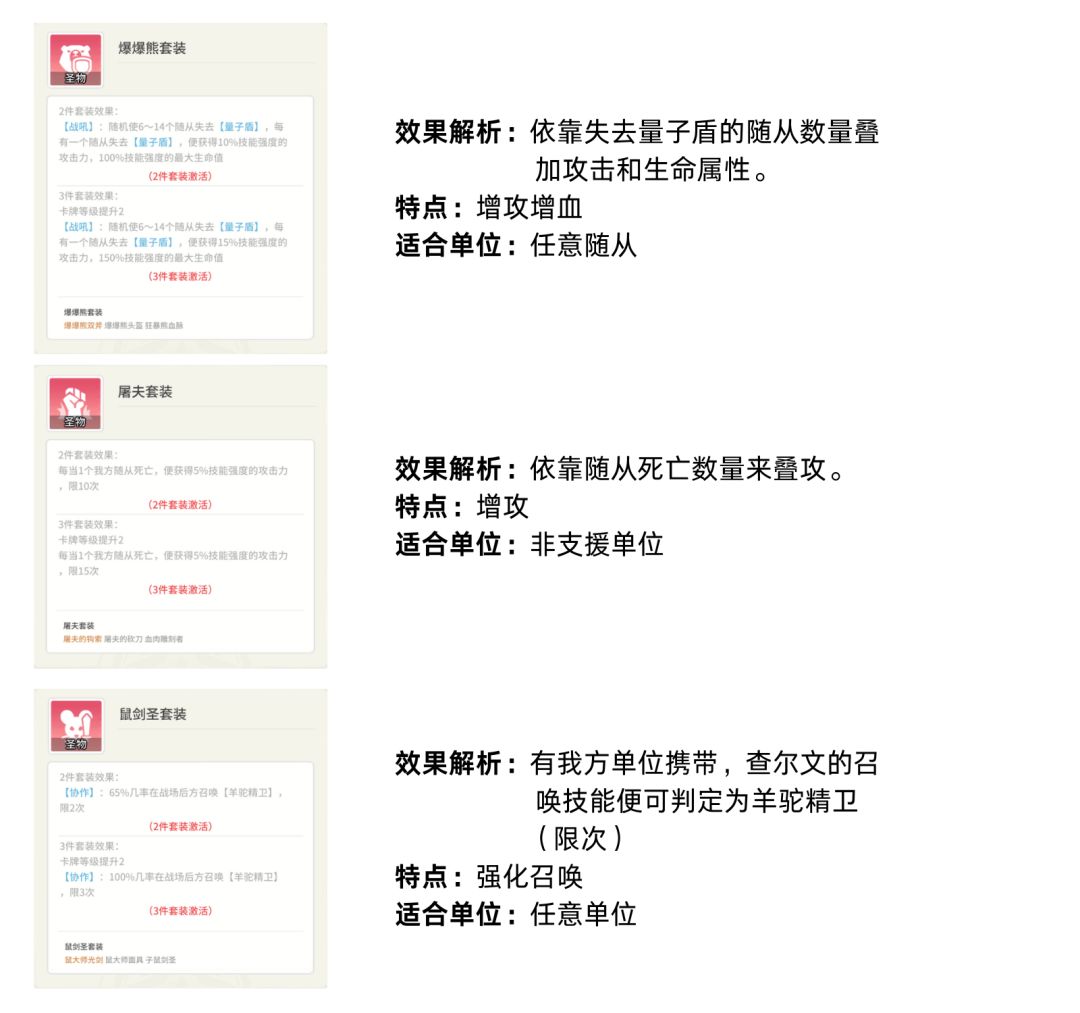 爆爆熊套装:更适合蝙蝠队长这种站桩型随从使用,起到增攻增血的效果。同时破盾的前置条件非特定我方随从,所以也可以对对方随从进行破盾来为我方提供收益。关于此点适用于竞技场。也要注意我方随从摆放位置,不要将量子盾单位放置在携带此套圣物的随从的左侧,会直接吃掉我方随从的量子盾。