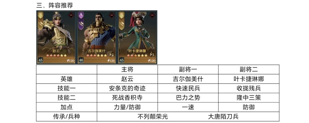 该队伍主要克制恐慌队和突击队,能克制这两大强队,主要有两个优势,第一个是兵种克制,因为像突击和恐慌这两个队伍,一般都是主玩骑兵,然后第二个优势则是死战香积寺可以全体禁疗,克制突击队回复兵力。然后叶卡捷琳娜则可以让恐慌队发动的主动技能失效。