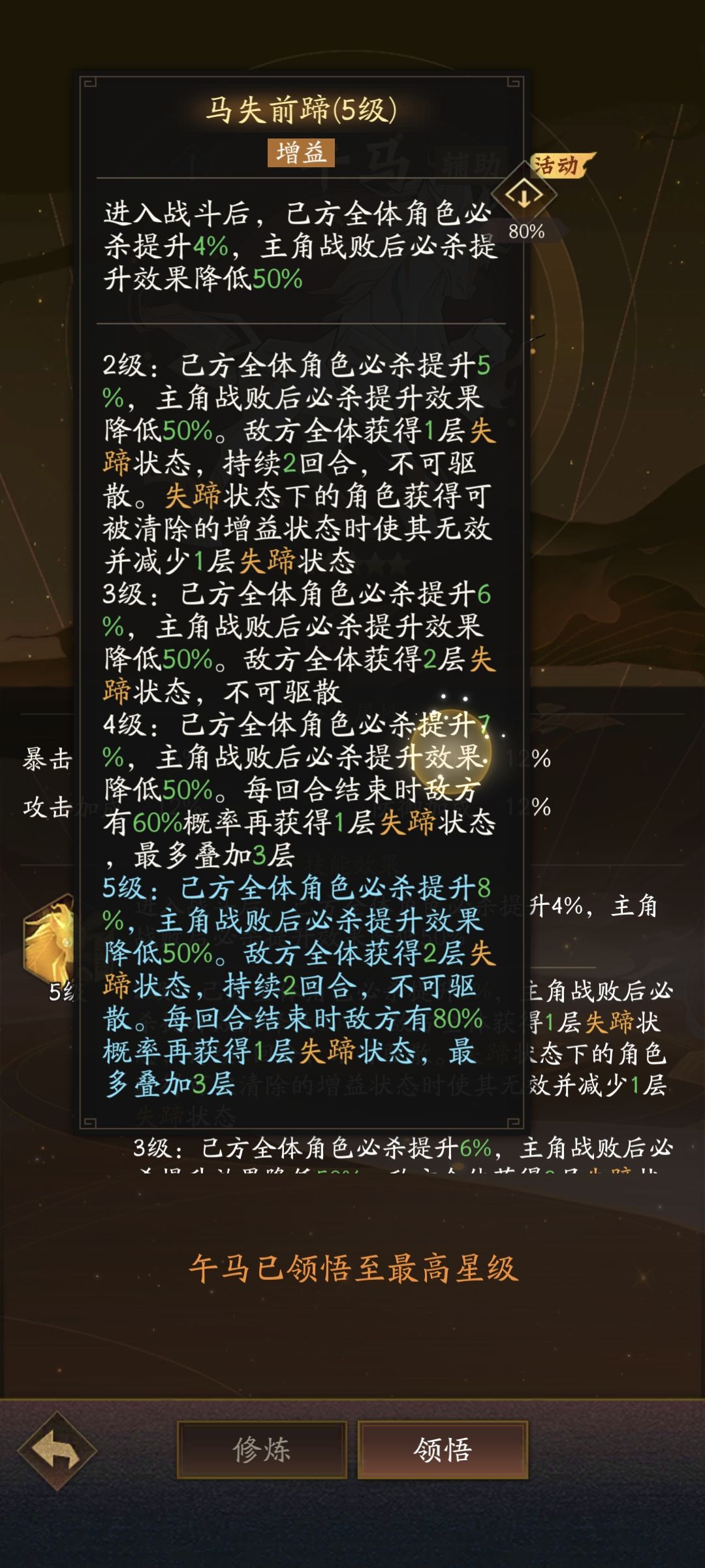 3)每回合结束时,敌方有80%概率再获得1层【失蹄状态】,最多叠加3层。