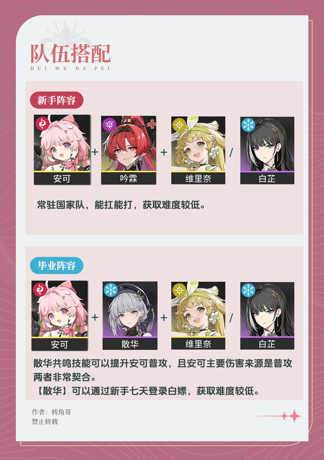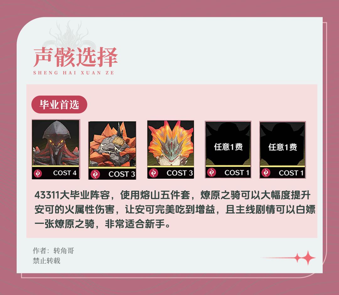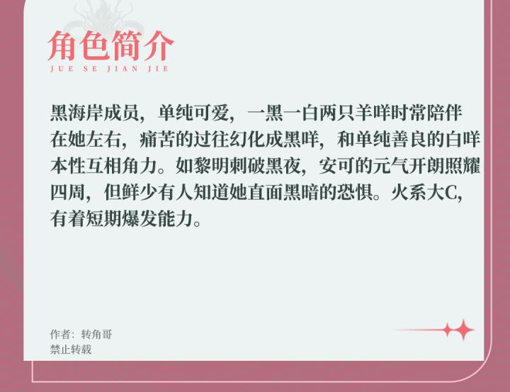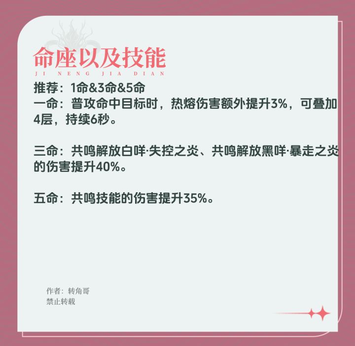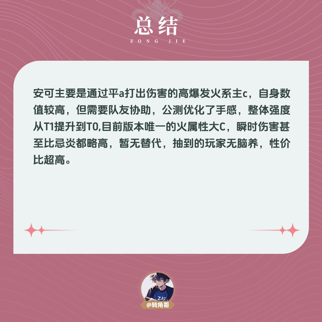 安可主要是通过平a打出伤害的高爆发火系主c,自身数值较高,但需要队友协助,