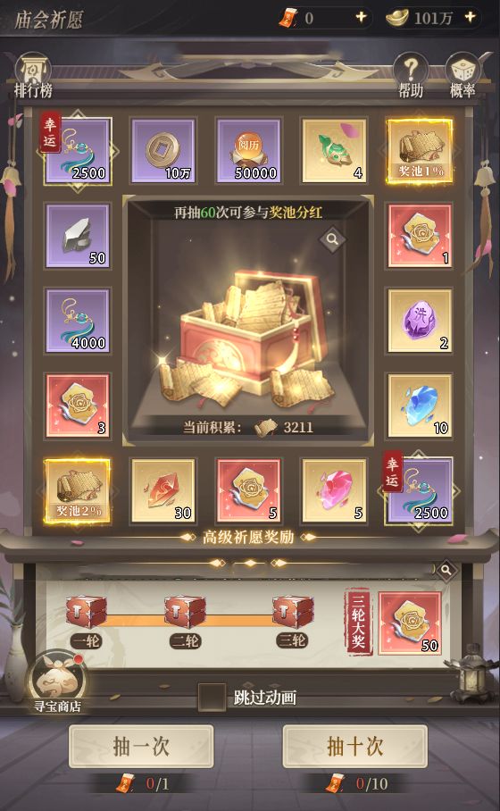 消耗“庙会抽奖券”可在【庙会祈愿】进行抽奖活动,累计抽奖达到一定次数可参与中间奖池分红,祈愿分为普通祈愿、高级祈愿(普通祈愿有幸运格子,抽中后可转变为高级祈愿),少侠们抽奖时有概率抽中百分比奖池奖励。