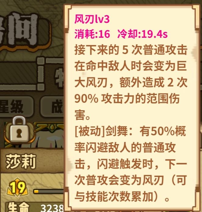 技能16消耗24cd,5次普攻造成2次70%/80%/90%的范围伤害。被动30%/40%/50%概率闪避并叠加风刃。
