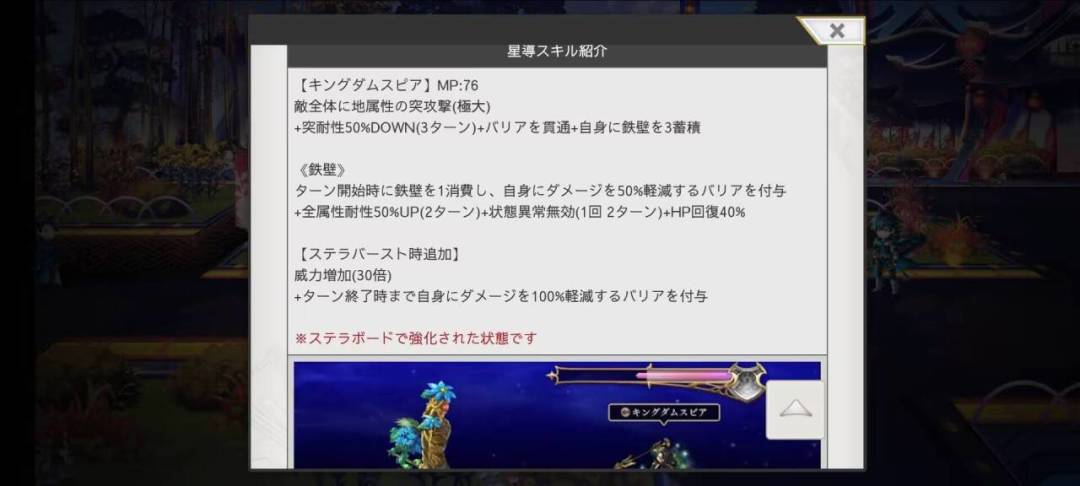 回合开始前消耗1珠,赋予自身减轻50%伤害屏障+全属耐50%up(2回合)+状态异常无效(1次2回合)+生命回复40%
