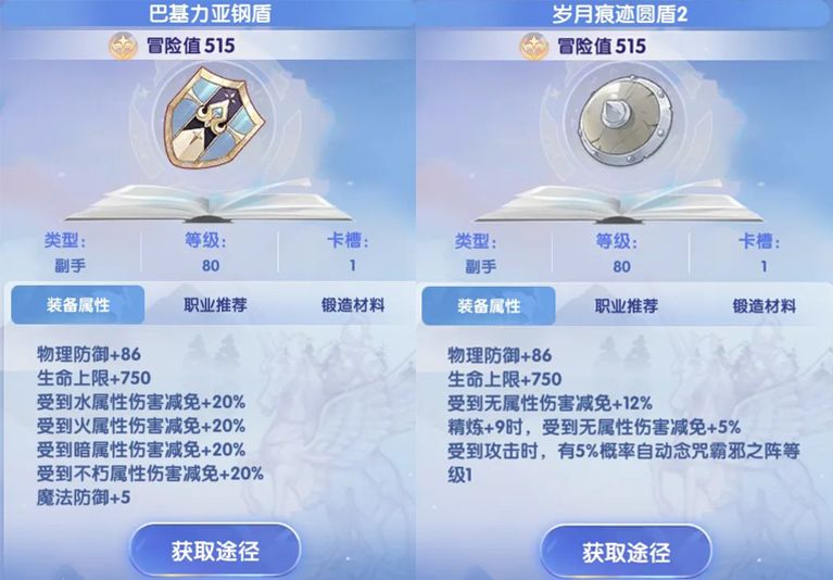 副手:*盾牌()、巴基力亚钢盾、岁月痕迹圆盾