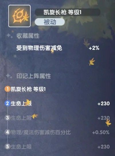 - 流派印记:凯旋长枪(因为升级给生命上限+免伤)