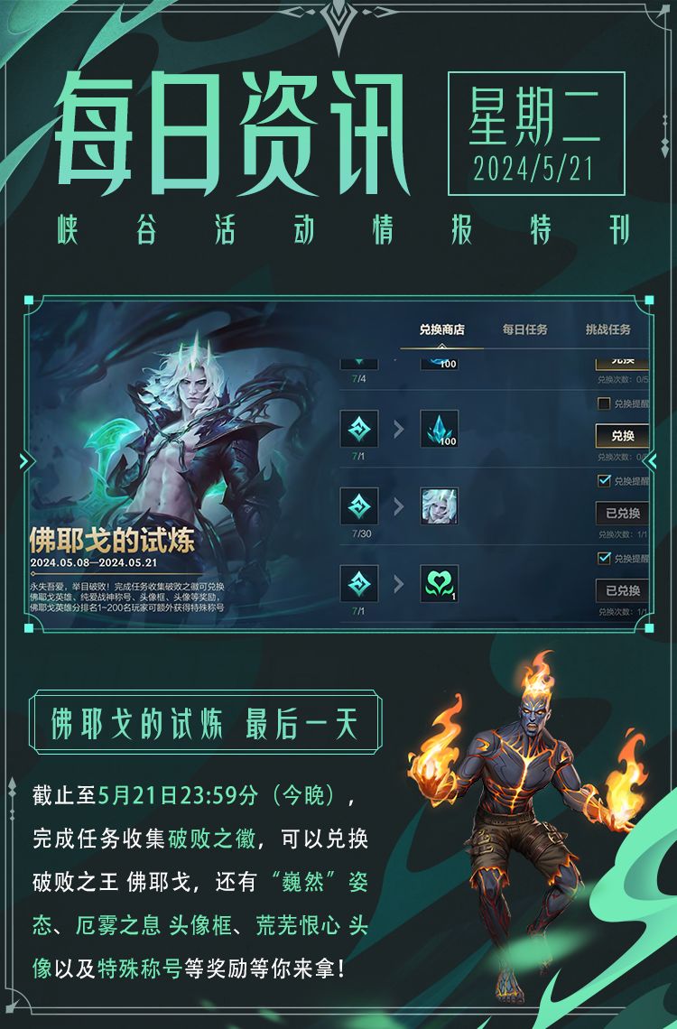 光明与破败激战,你为谁而战!截止至5月31日23:59分,召唤师参与活动完成任务,即可赢取暗影吞噬 大厅背景和龙魂水晶*500奖励!