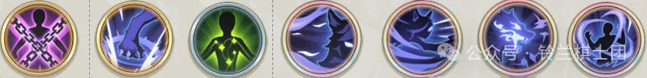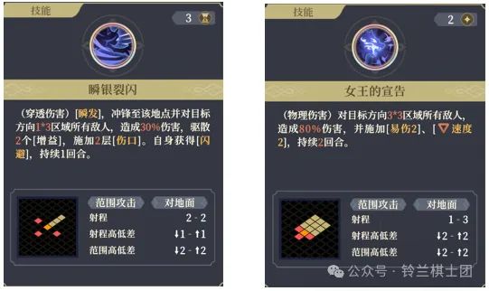 3阶骗豆阶,左右两边都是阿加塔相对常用技能。左侧瞬发技,有范围伤害、可驱散增益,还能附加伤口,协助触发自身后续效果,同时还提供提升生存的闪避效果。右侧女王的宣告,2费群伤,配合被动技能猎物的味道,可以超高频率释放,且施加的易伤2、降速度2都是非常优质的debuff。