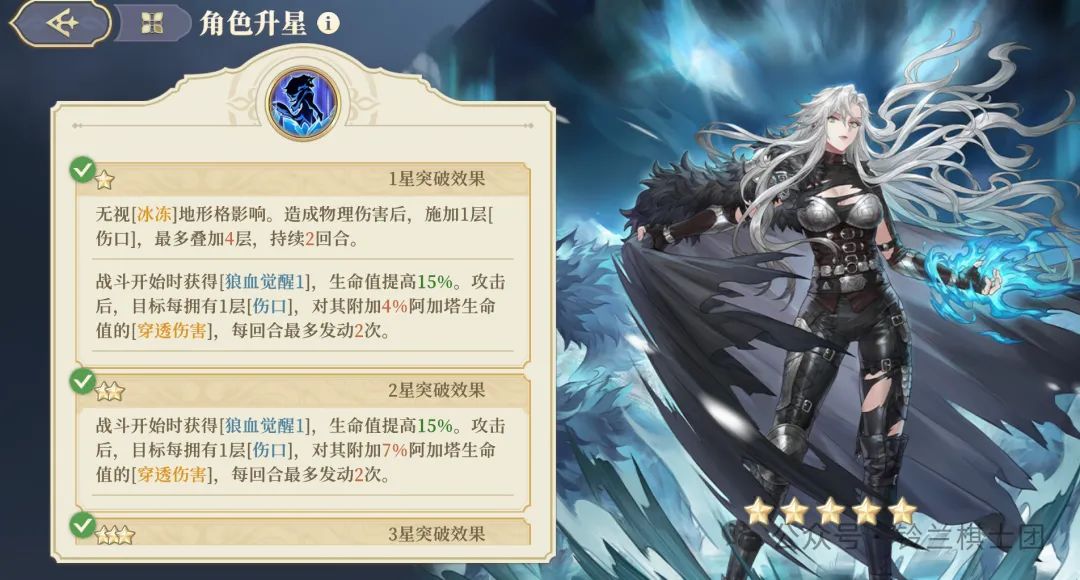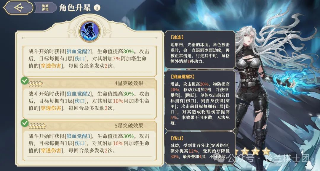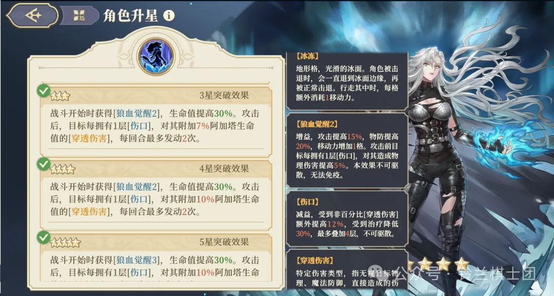 满星阿加塔关键的狼血觉醒效果,移动力加成+2、同时拥有攀爬+跳跃,自身还可对伤口目标单体对战前、额外享受穿甲效果,机动能力和伤害能力拉满。
