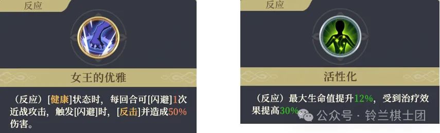 5阶反应技,推荐点左侧女王的优雅。该反应技提升了阿加塔生存和反击伤害能力。如果领悟之力充足,右侧活性化可以考虑补点,该阶左右两侧均提供实用的攻击加成,另外部分生存压力不大的关卡,活性化提升生命值上限,对阿加塔也非常实用。