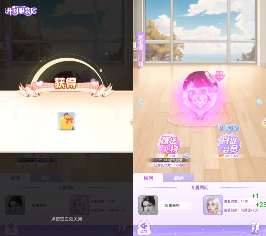 🎁使用礼品袋可赠送顾客礼物,增加顾客好感度,同时赠礼还能提升每个顾客的专属顾问店员的闪耀值