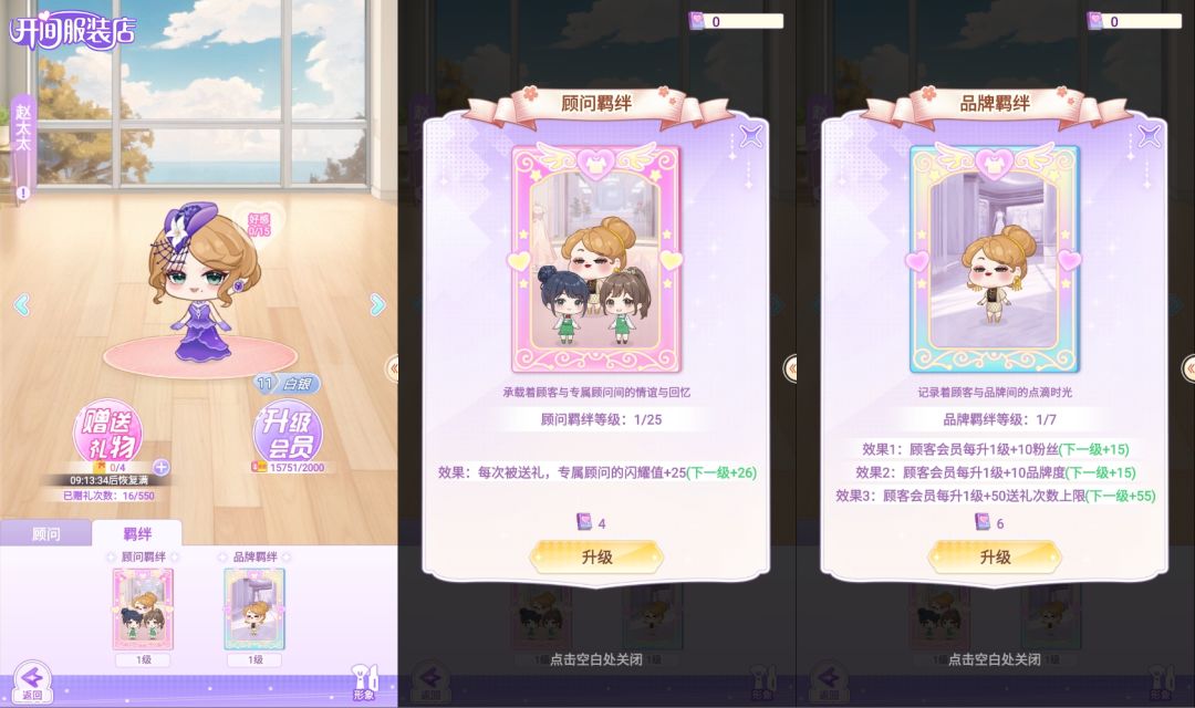 🤗顾客每次在服装店或者包包店购物一次,获得顾客经验,顾客经验可用户顾客等级提升,顾客等级提升可获得品牌度和送礼次数上限