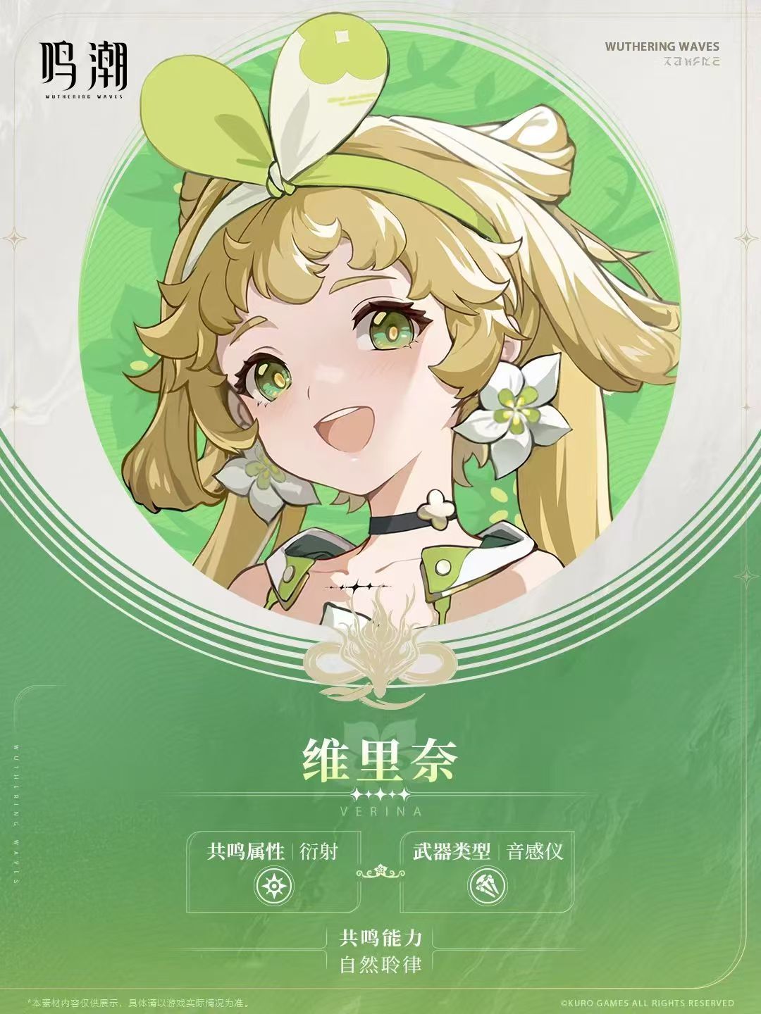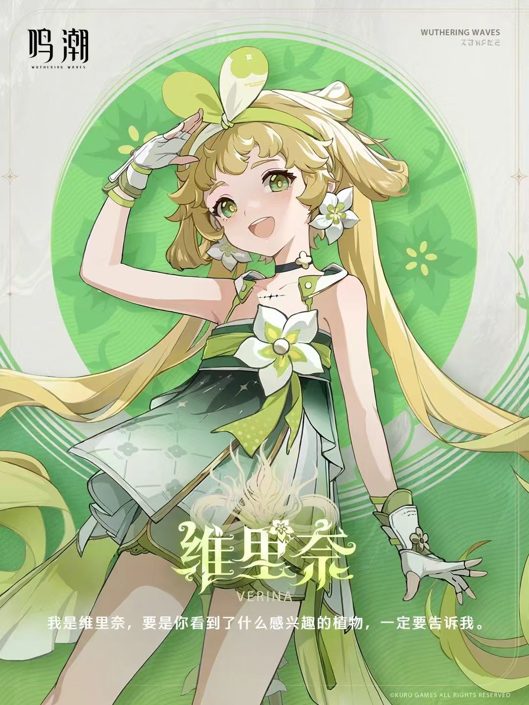 维里奈(CV.赵爽)—鸣潮小萝莉,萝莉党狂喜!游戏内独一无二的重击滑铲,更是独一档,普攻,技能,大招都带有浓厚的草元素,喜欢维里奈的朋友,冲!!!