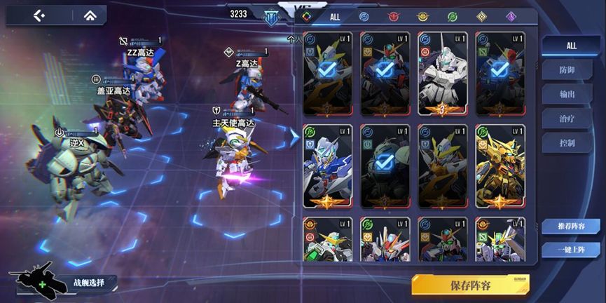 主天使高达具有较强的承受伤害和恢复耐久能力,作为前排吸收伤害。逆X的群体伤害能够压低敌方耐久,配合盖亚高达对低耐久敌人有额外伤害,进行有效输出。战舰选择拉·凯拉姆战舰,可大量增加机体对瘫痪目标的伤害,更快压低对方机体耐久。