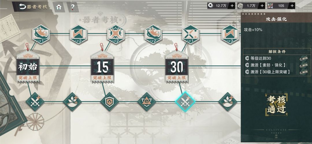 考核下边一排属性不建议点满,点到第五个(攻击10%足以)
