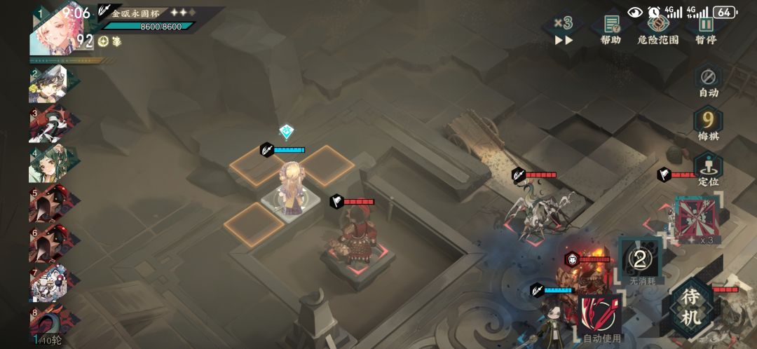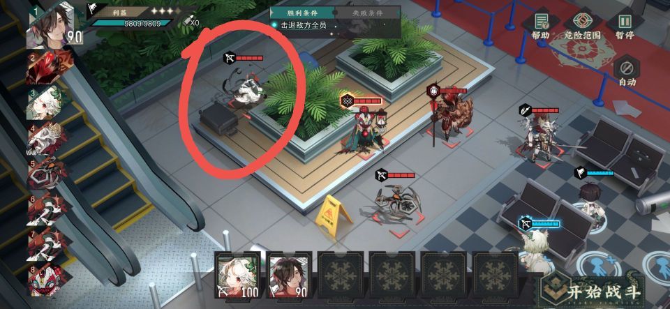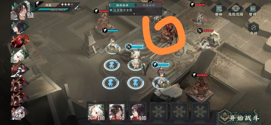 1.开局站位调整,下图这个盾怪技能是随机拉一个角色到他跟前,然后缚地,除了轻锐其它谁也跑不了。解决办法一是用十二给他技能晕住,二是重开调整轻锐站位,重开之后他还是拉之前那个位置。
