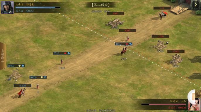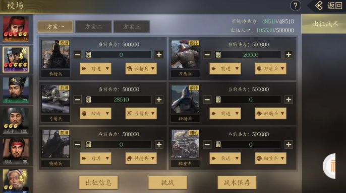 开打之前,玩家们有排兵布阵的机会。可以自由协调长枪兵、刀盾兵、弓箭兵、轻骑兵、铁骑兵、辎重车、床弩、冲车和投石车的占比,单次出战的部队总量是固定的,你只能在这个量以内进行兵种结构的配比。