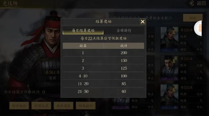 当前版本的《军令如山:王者之心》竞技场活动,需要主线任务开启第七章以后才能参与。这道门槛对于普通玩家而言并不高,每天可以打10次,额外增加挑战次数则需要多付门票费。全程并不占用多少时间,而且可以自动进行,奖励还很不错,建议各位有时间必做。