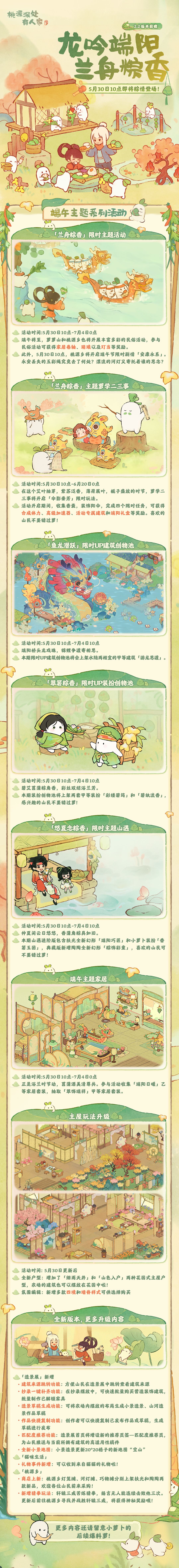 端午将至,萝萝山和桃源乡也将开展丰富多彩的活动萝!参与活动可获得活动专属建筑、端阳礼盒以及玎当等丰厚奖励。同时端午节限时剧情「安康永系」也将一同开启,山民不要错过奖励啦!