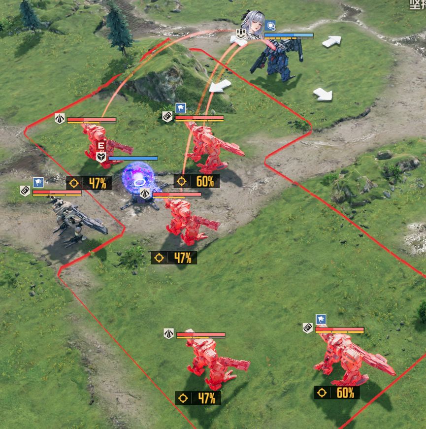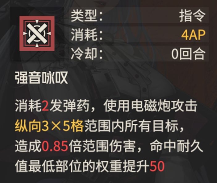 强音咏叹:3*5范围的电磁炮攻击,4ap,0.85倍的范围伤害,同时附带具有玄学的命中最低部位权重提升,类似的技能则是洛莎的大招肃清,二者相比,洛莎简直要哭死,ap比别人多花费1点,却只有0.15的倍率提升,也没有其他额外效果。