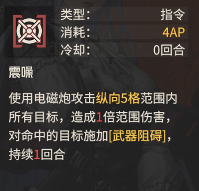 震噪:4ap电磁炮技能,与电磁炮普攻相似,额外花费1ap换取附带武器阻碍效果,除了普攻,其余所有技能都无法使用