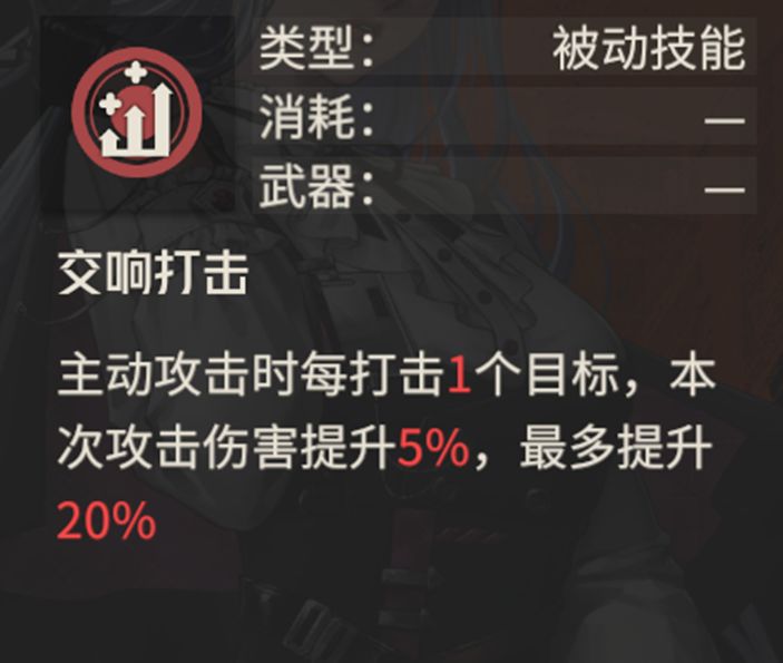 交响打击:被动增伤技能,视同时打击目标数量提升伤害,对于范围攻击为主的菲娅来说,触发非常容易