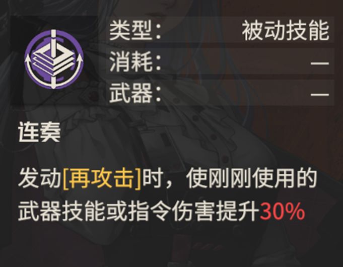 连奏:提升再动后的伤害,此技能如果没有限定刚刚使用的武器,那么会是相当强力的技能,但是有了限定,变平平无奇,也不能通过放线圈获得伤害提升