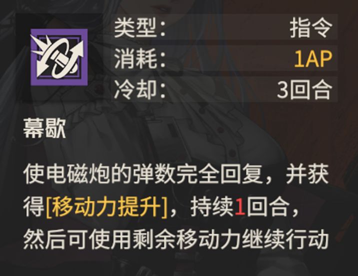幕歇:弹药填充技能,电磁炮战术家安身立命之本,与肖妮同类型技能有异曲同工之妙,不同的是命中率提升更换成了移动力提升