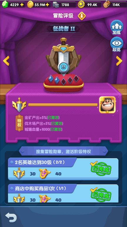 冒险评级在外城中是实力与成就的象征。通过完成各种挑战和任务,搜集冒险勋章来激活阶级特权,进而带来资源产出的显著提升。市政厅、金矿、铁矿和木材等资源点的产出将因您的冒险成就而增加,为城池建设和英雄培养提供更丰富的物资。随着评级的提升,城墙的防御能力和弓箭手的攻击力也将得到增强,让您在战斗中更加坚不可摧。冒险评级的提升不仅是解锁防御塔的重要任务之一,它还将解锁更多新奇的玩法、稀有英雄,以及关键的英雄培养资源,为您的冒险之旅增添无限乐趣和挑战。这使得冒险评级成为您在罗兰大陆上不断进步和成长的重要标志,让您的每一次探索都充满惊喜和成就。