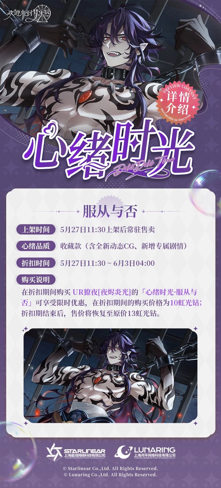 - 售价:在折扣期间购买「心绪时光·服从与否」可享受限时优惠,在折扣期间的购买价格为10虹光钻,折扣期结束后,售价将恢复至原价13虹光钻。