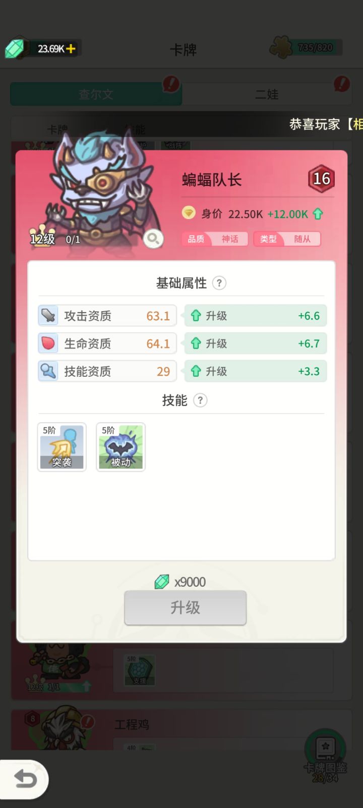蝙蝠队长:技能1突袭(当敌方有随从在战场时,立刻对最近的敌方随从进行近战普攻)获得1次突袭,15级太阳突袭次数30,满级次数翻倍为60次.技能2每次普攻有2%几率在战场后方召唤3只具有12次守护的血仆,限3次。满级太阳几率提升为20%,守护具有无限次。蝙蝠虽然没有技能带有量子盾,但是技能清怪还是可以的,除了权杖以外作为副c还是很顶的,而且本身面板属性很高,建议15级加圣物。且可以上一太阳一月亮。圣物和彩卡兑换都需要,有多的保留。![[表情_送花]](https://img.tapimg.com/market/images/68b3dc8473df915ad2b85da5efef4f56.png)