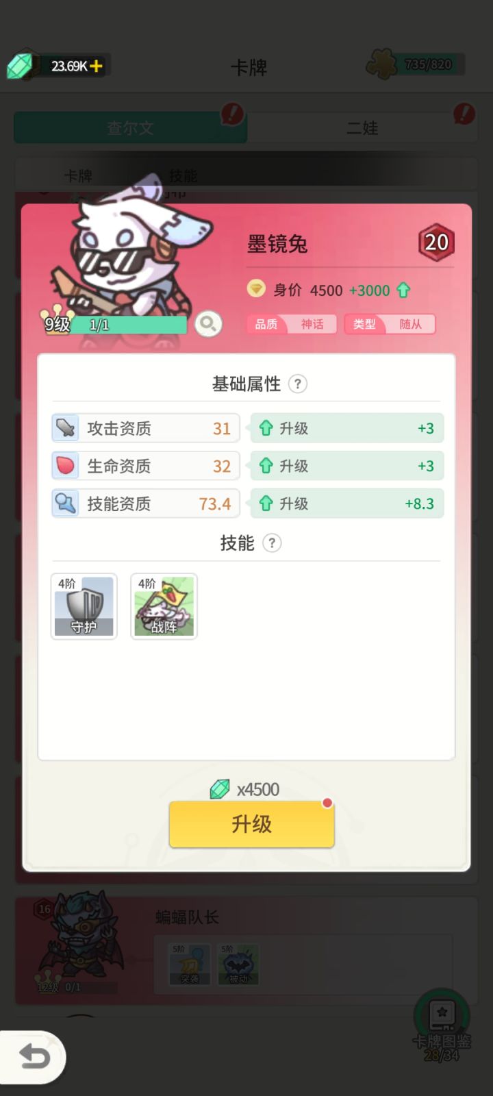 墨镜兔:技能1获得12次守护,15级25次,满级无限次。技能2同排左侧以及前两排每有一个卡牌,墨镜兔的费用减少两点,限一次。15级上限8,满级为战阵上有其他我方卡牌即可减少费用。墨镜兔的费用为20点,第二个被动可以做到0费用,而且面板也还不错,月亮能做到双百左右.。墨镜兔也建议保留,不作为材料卡,但没必要硬追15.
