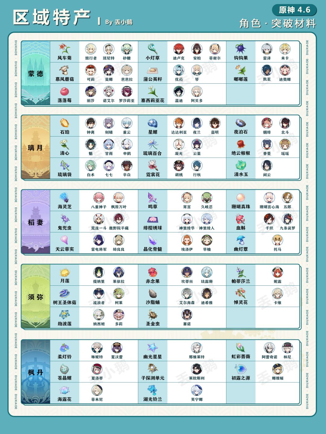 我是丢小鹅,为你带来【原神4.6】全角色突破/天赋材料一览表。