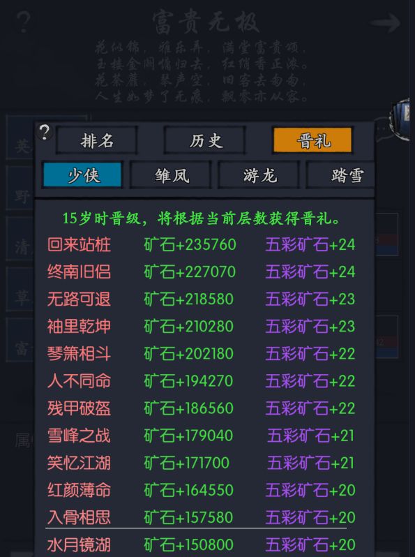 在岁数毕业(15岁,17岁,20岁,25岁)会根据层数发放奖励 左边的名字代表层数