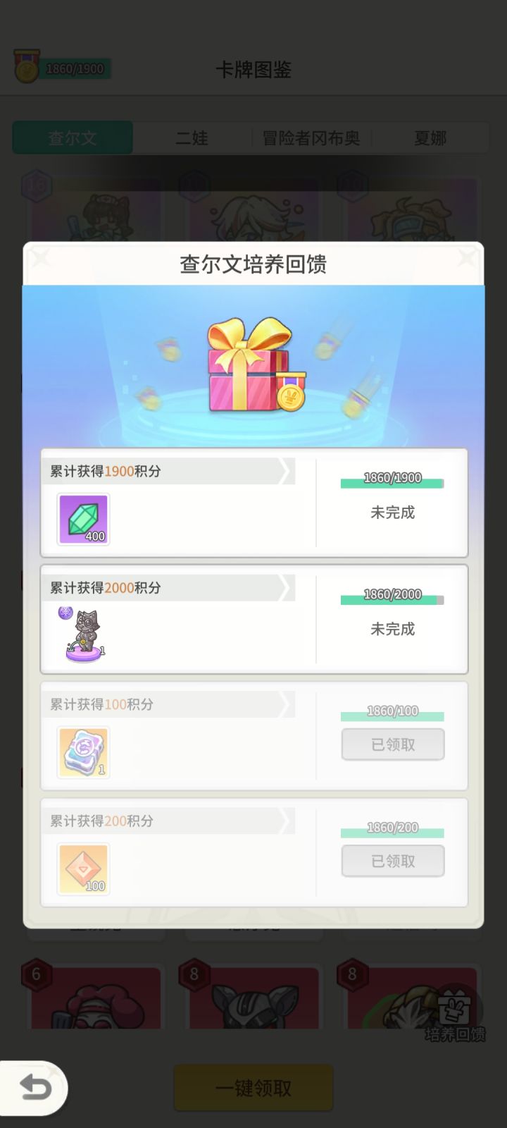 3.图鉴积分重置 并重置了培养进度中的"获得卡牌" "卡牌等级"和"获得圣物"任务 及时领取已完成的回馈奖励 圣物跟卡牌都可以领取记得领完哦 白嫖的奖励 重置任务应该是可以每赛季反复领取