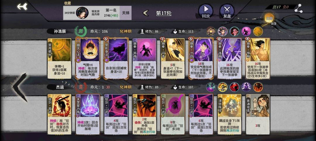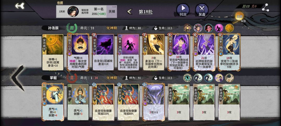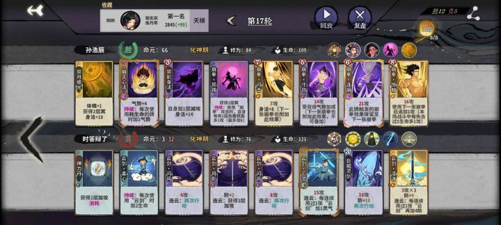 具体来说元婴前输赢无所谓,能赢最好,赢不了就把加体魄的前置保证疯魔来了之后第八轮准时元婴。飞云丹留一手防玩剑阵和土灵的,驱邪丹前期很好用能回不少血还加盾 ,幽冥放在崩灭后面可以多加气势,闪击没来之前多余的幽冥不要合放上去加气势。除了玩盾和带护体的基本没有怕的(盾拿飞云丹处理,护体拿惊触处理),回血还是打伤害很少能有能抗住四动杀的,而且这套基本上十七轮就结束战斗,避免进入后期对面大成型。真有那种两动三动就能打出巨量伤害的就拿惊触和他对位,也是够用的,至于两动三动直接秒人的就让他赢吧,毕竟都胡成那样了。