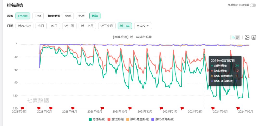这款游戏在App Store畅销榜高居第二,中国区ios免费榜第一,获得了6500万+用户和3500+万月度活跃用户,在港澳台地区上线后于App Store畅销榜&免费榜霸榜3个月。根据七麦数据显示,在23年6月推出之后它一直维持高企,截至24年年初,依然在竞速和体育类畅销游戏中名列前茅。