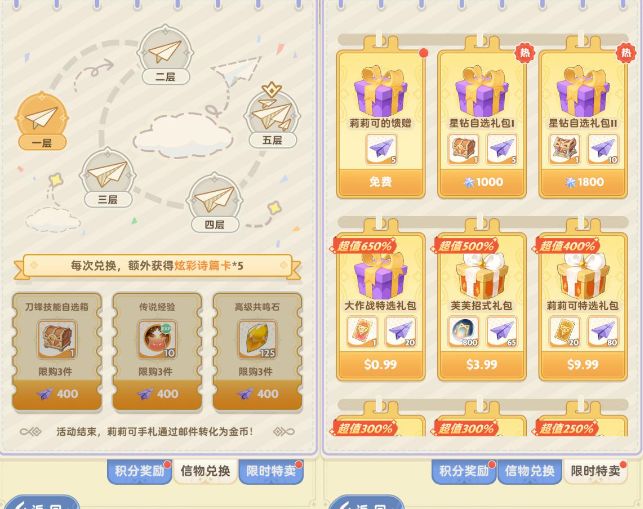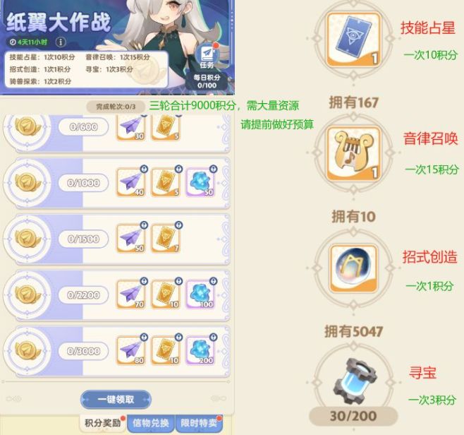 纸飞机活动是重要的资源获取途径之一。玩家可以通过囤积大量资源领取纸飞机兑换奖励。在纸飞机活动中,第五层兑换奖励需要930个纸飞机,其中900个可以通过积分获得,另外20个可以通过特卖获得。因此,玩家需要合理规划资源使用,以便在纸飞机活动中获得更多奖励。