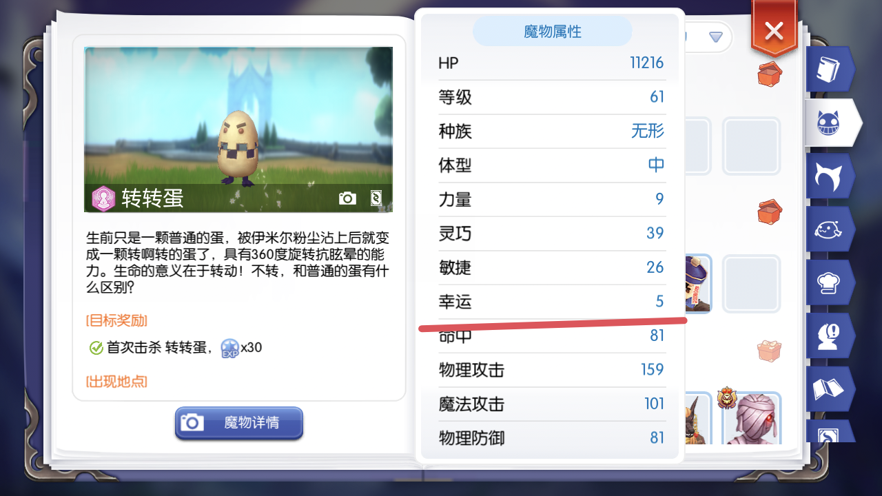 下面重点来聊聊暴击,如何做到100%的暴击呢?有的小伙伴说暴击100就行,这得看打什么怪了,因为每个怪的暴击防护数值不同,如列图里的转转蛋和绿饼人,暴击防护数值区别一个天上一个地下。怪物的暴击防护数值没有直接写出来,但是和幸运是直接相关的,幸运值除以5基本就是这个怪物的暴击防护数值。暴击减暴击防护数值就是最终的暴击值。所以转转蛋的防爆是1,暴击101就能刀刀暴击。同理绿饼人幸运是389除以5大概是78,所以想要刀刀暴击绿饼人暴击要到178才行,178-78=100。
