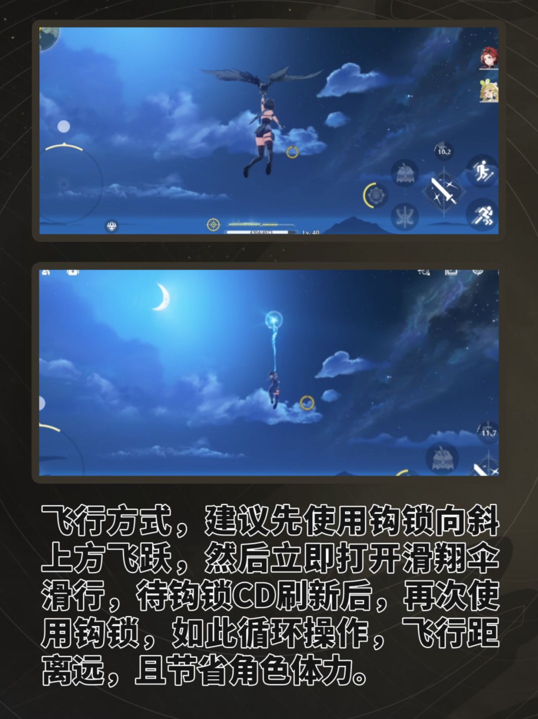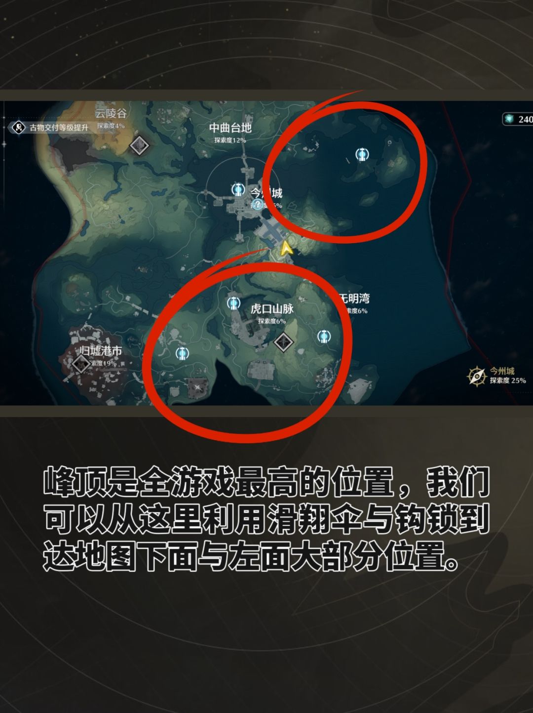 我们只要在此处利用滑翔伞与钩锁(使用方式见图),就能到达地图右边与下边大部分位置,即便是隔海相望的“原点科考站”。只要不断重复“传送回山顶传送点,再飞到想去的地方”的过程,很快就能够解锁半张地图的传送点,无视任何地形与怪物,轻松简单。