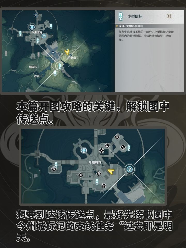 而解决问题的准备工作,只需要解锁一处新手(今州城)附近的传送点即可。这座传送点位于“屛庭山”的一座山峰上,详细位置可以看上面的图。