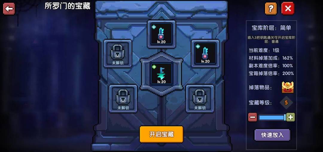 初始界面如下,我们可以看到中间只有三个孔解锁了。此时,我们只需要放入最低级的蓝色钥匙,打一下,就可以开启更多孔了,直到开启6个孔为止,这时,我们才开始放红色品质的钥匙(六个孔都要放红色的)。如此才能享受到最高掉落加成。