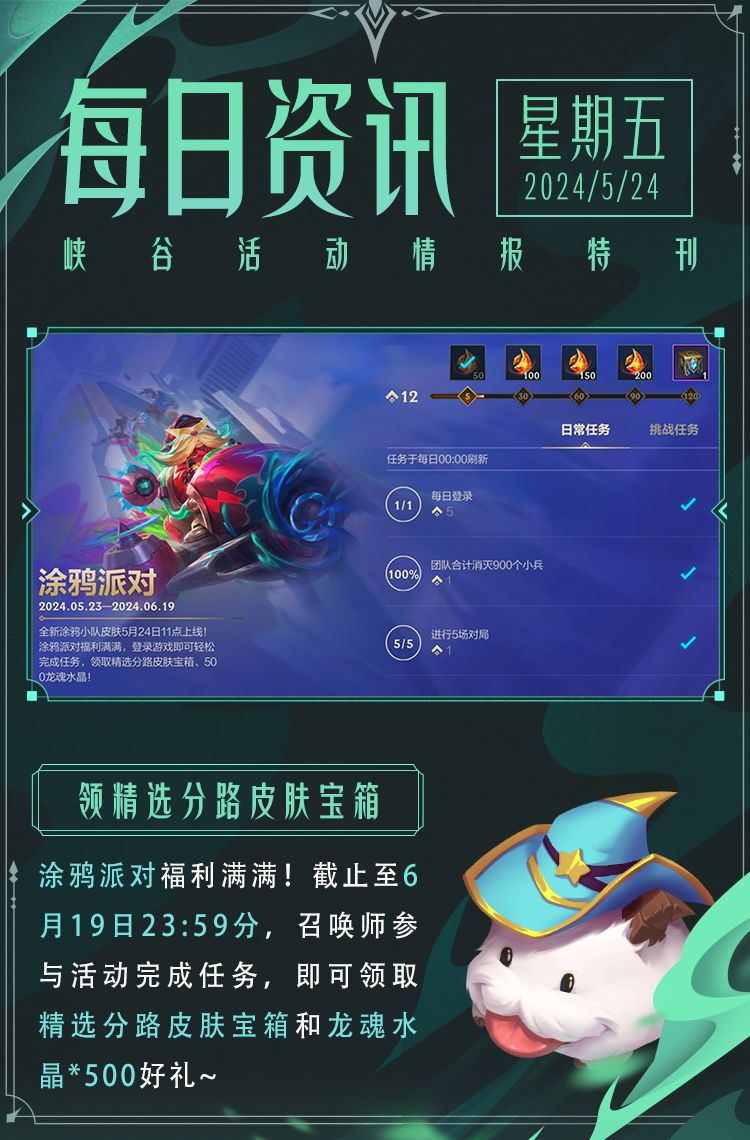 涂鸦派对福利满满,这是一场不容错过的狂欢!截止至6月19日23:59分,召唤师参与活动完成任务,即可领取精选分路皮肤宝箱和龙魂水晶*500好礼~