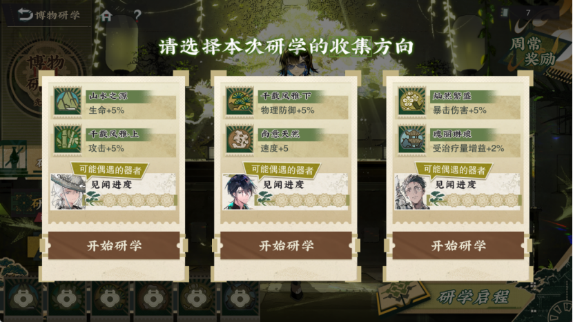 既然研学启程才是重点,那么接下来就详细说说吧,不论开始选择哪种收集方向,开启的旅程固定为剧情-剧情-战斗-剧情-剧情-战斗-剧情-BOSS。选择不同的方向,未来可以收集提升的编队属性也不同选好方向后,前两小关都是剧情,需要与对应的器者对话。