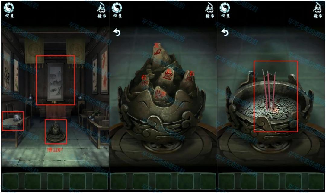 一、首先点击下图的中央的画,然后跟左边【茶桌桌布】下面的图案就能得到解锁【五岳】图案的左右位置。然后在根据五岳的左右位置,调整中间的【博山炉】,详细请看下图。然后就能获得【点燃的线香】。